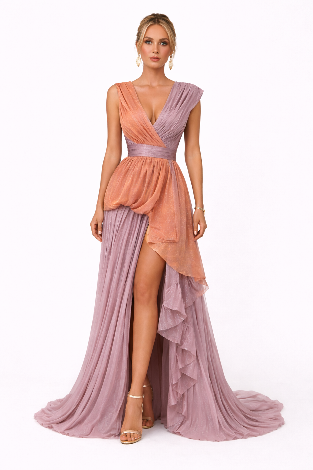 فستان سهرة طويل بتصميم أنثوي راقٍ، يأتي بتدرج لوني أنيق باللون الوردي الغباري مع درجات موف ناعمة تضيف لمسة فخامة وجاذبية. يتميز بقصة صدر متقاطعة على شكل حرف V تُبرز جمال القوام، مع خصر محدد يمنح مظهراً متناسقاً وأنيقاً. تنسدل التنورة بطول كامل بخامة خفيفة وانسيابية مع لمسة لامعة خفيفة تعكس الإضاءة بشكل جذاب، بالإضافة إلى شق جانبي أنيق يمنح حرية في الحركة ولمسة عصرية. خيار مثالي للمناسبات المسائية، السهرات الراقية، وحفلات الزفاف. (جيس)
