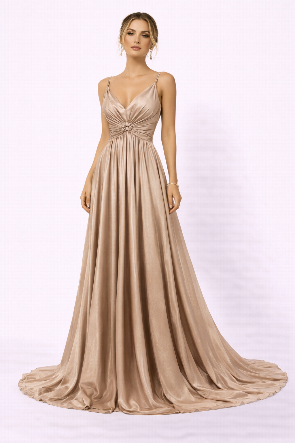 فستان سهرة ذهبي بلمعة ميتاليك وتصميم صدر (مارسينو)