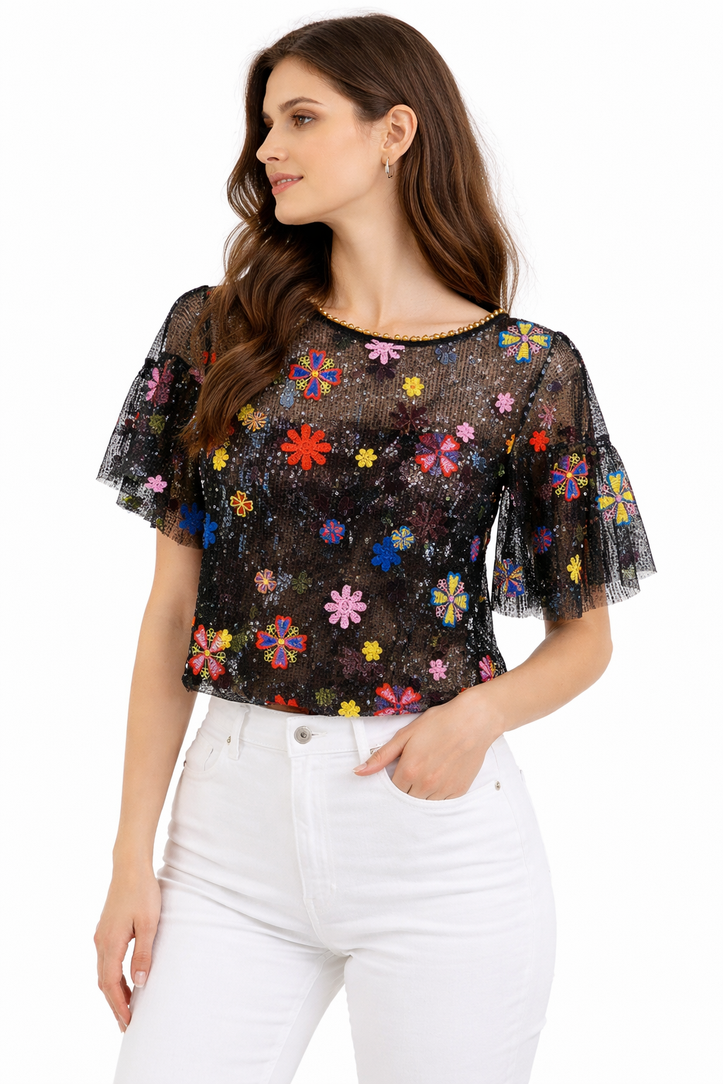 بلوزة سوداء شفافة بزهور ملونة. (هانيتا)