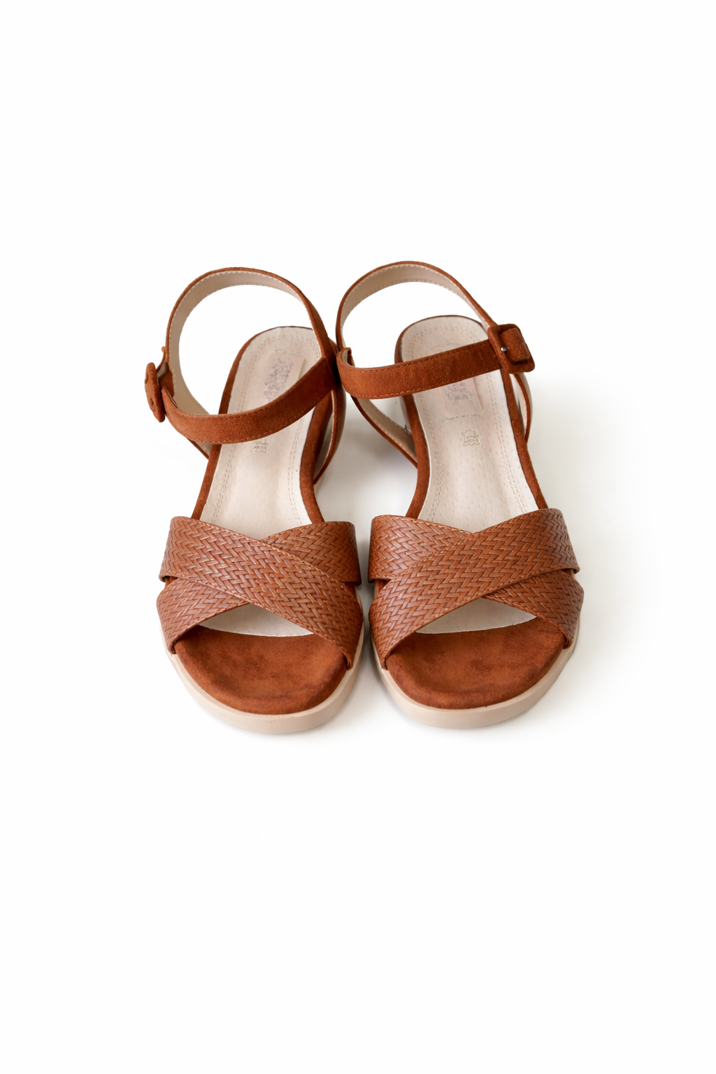 أحذية نسائية من MGTN بتصميم أنيق وخامات مريحة، مثالية للاستخدام اليومي والمناسبات المختلفة صندل كلاسيكي بلون هافان دافئ يتميز بسيور متقاطعة ومنسوجة، يضفي لمسة ريفية ساحرة تليق تماماً بإطلالات الصيف الأنيقة.