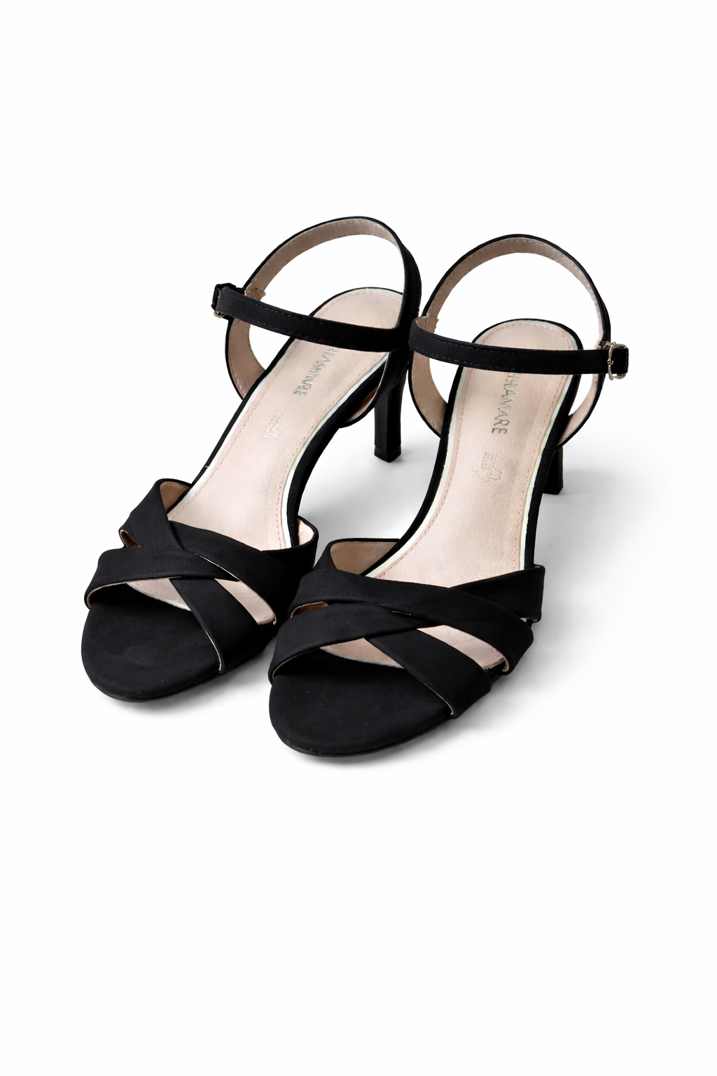 Mariamare براند أحذية نسائي عصرية بتصميمات أنيقة وجودة عالية، أصلي 100% ومصنوع في إسبانيا ليجمع بين الموضة والراحة في كل خطوة. صندل أسود شامواه فخم بتصميم سيور متقاطعة أمامية وكعب عريض مريح، مع حزام كاحل رفيع يمنحكِ إطلالة أنثوية كلاسيكية.