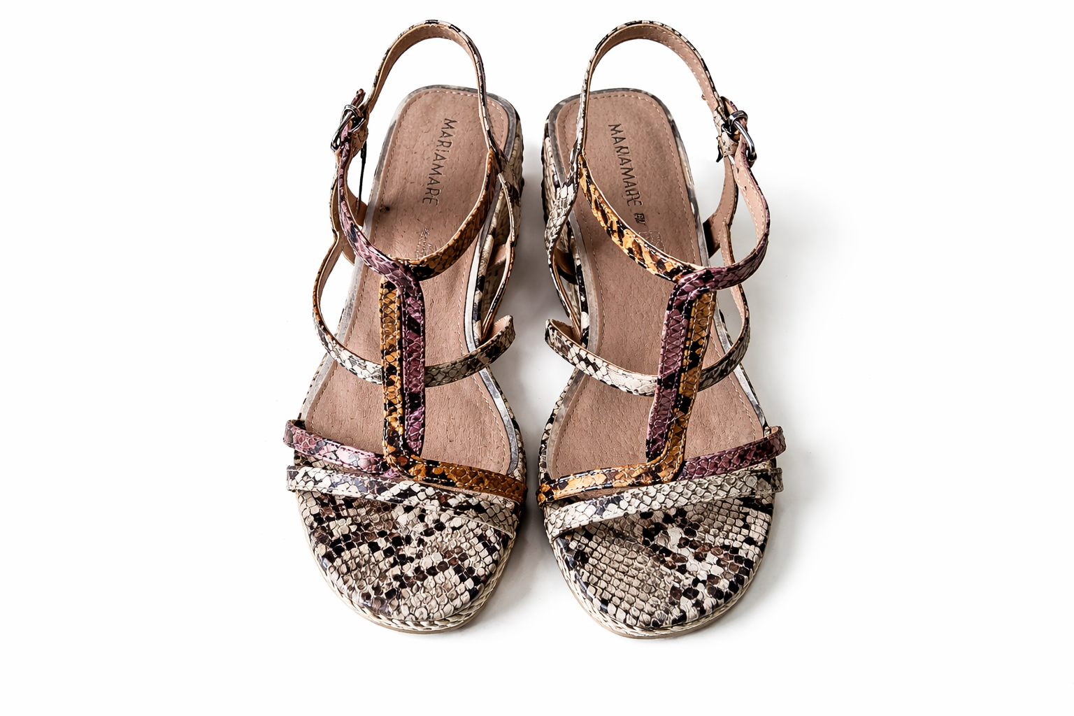 Mariamare براند أحذية نسائي عصرية بتصميمات أنيقة وجودة عالية، أصلي 100% ومصنوع في إسبانيا ليجمع بين الموضة والراحة في كل خطوة. صندل "ويدج" عصري يتميز بنقشة جلد الثعبان الجذابة مع سيور متداخلة أنيقة ونعل "إسبادريل" مرتفع، مزود بفرش جلدي مريح لضمان الأناقة والراحة في آن واحد.