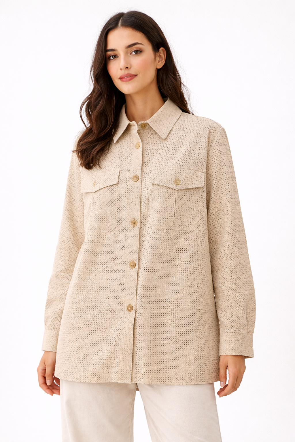 قميص "هانيتا" الإيطالي بلون بيج راقٍ وقماش محكم الملمس، يجمع بين كلاسيكية الجيوب الأمامية وعصرية القصة المريحة ليمنحكِ إطلالة يومية فخمة وعملية.