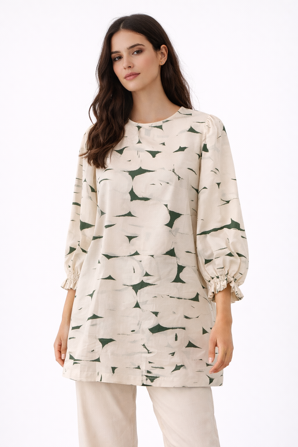بلوزة بيج طويلة منقوشة برسومات خضراء وأكمام مكشكشة. مركه هينيتا