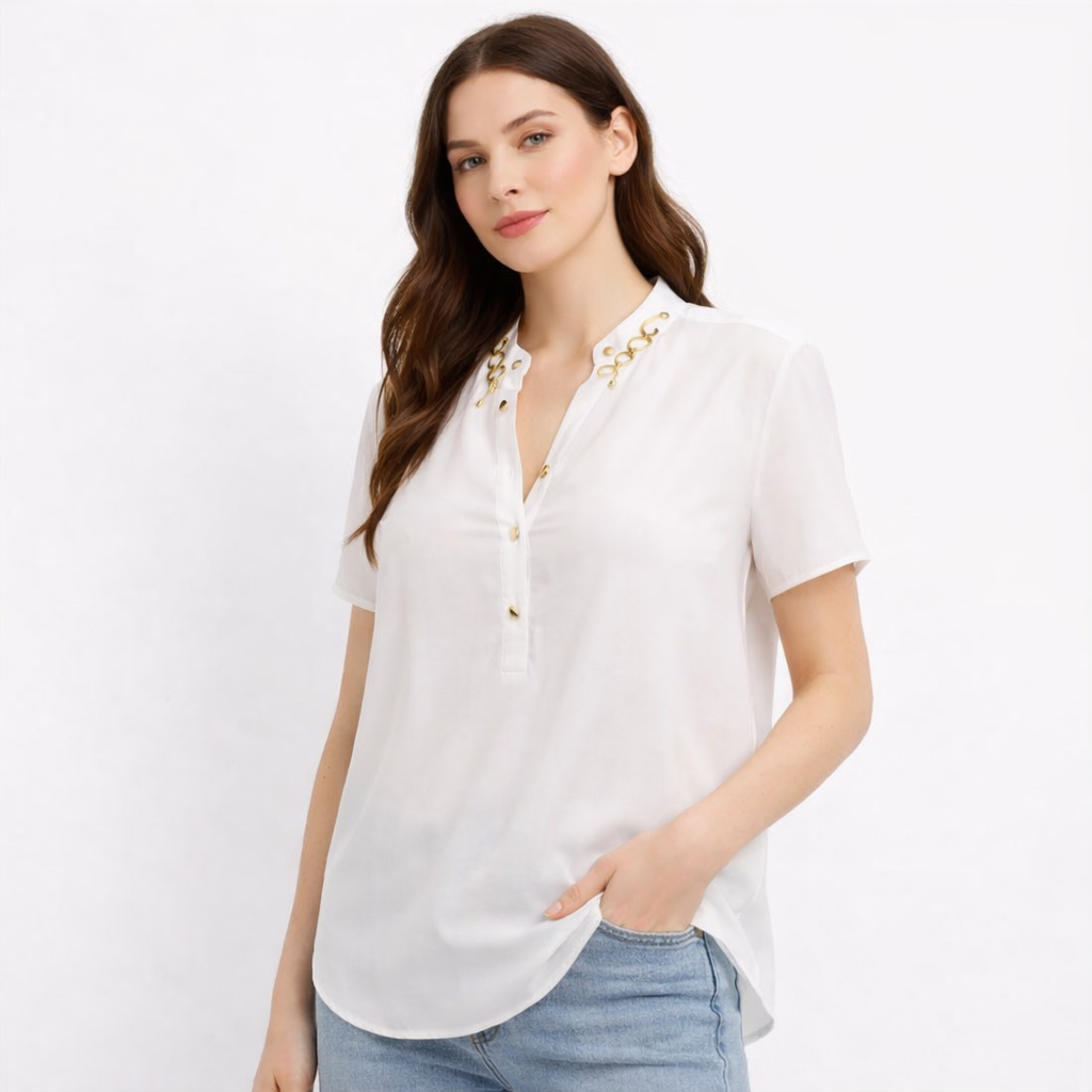 بلوزات جيس تجمع بين الأناقة العملية والخامة المريحة، بتصميمات عصرية تناسب الإطلالات اليومية والرسمية. خامات عالية الجودة وقصّات أنيقة تمنحك مظهرًا راقيًا وسهل التنسيق. بلوزة بيضاء ناعمة مزينة بتطريز ورد راقٍ وتصميم ياقة كلاسيكية، تمنحك إطلالة أنثوية رقيقة وعصرية.
