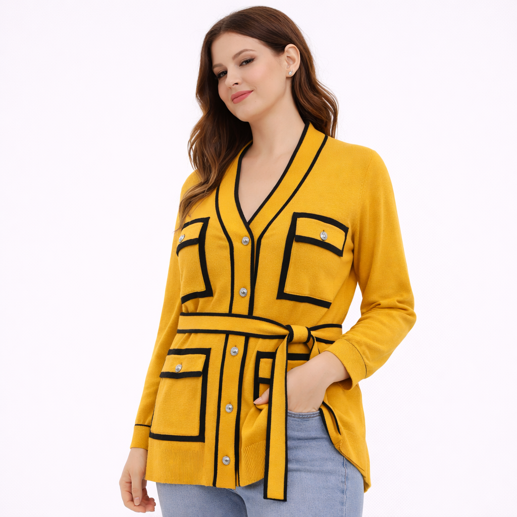 بلوزات هانيتا تجمع بين الأناقة العملية والخامة المريحة، بتصميمات عصرية تناسب الإطلالات اليومية والرسمية. خامات عالية الجودة وقصّات أنيقة تمنحك مظهرًا راقيًا وسهل التنسيق. بلوزة أنيقة باللون الأصفر الحيوي تتميز بأطراف سوداء متباينة، جيوب أمامية، وحزام خصر يمنحكِ إطلالة عصرية ومرتبة