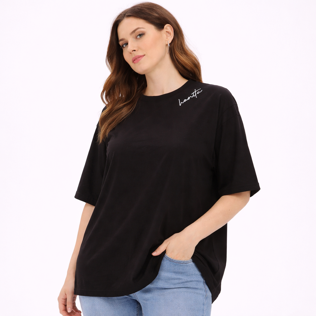 بلوزات هانيتا تجمع بين الأناقة العملية والخامة المريحة، بتصميمات عصرية تناسب الإطلالات اليومية والرسمية. خامات عالية الجودة وقصّات أنيقة تمنحك مظهرًا راقيًا وسهل التنسيق. بلوزة قطنية بتصميم "تيشرت" واسع (Oversized) باللون الأسود، تتميز بلمسة كتابة بسيطة عند الكتف تمنحكِ إطلالة كاجوال مريحة وعملية