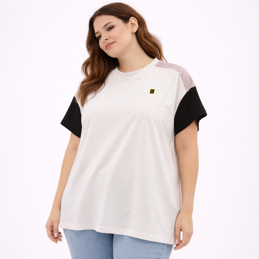 بلوزات هانيتا تجمع بين الأناقة العملية والخامة المريحة، بتصميمات عصرية تناسب الإطلالات اليومية والرسمية. خامات عالية الجودة وقصّات أنيقة تمنحك مظهرًا راقيًا وسهل التنسيق. بلوزة قطنية مريحة بتصميم تيشرت أبيض واسع، تتميز بأكمام قصيرة مزينة بتفاصيل ألوان (أسود ورمادي) متباينة، تمنحكِ إطلالة كاجوال بسيطة وعصرية.