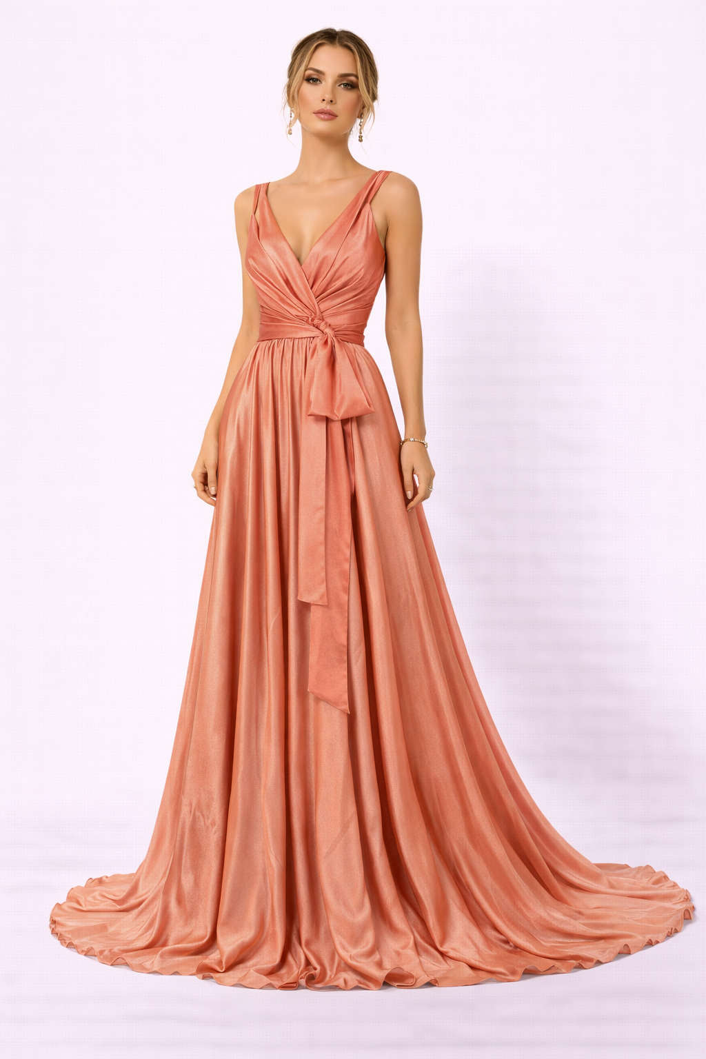 فستان سهرة مشمشي بلمعة ميتاليك وتصميم أربطة متقاطعة أنيق. (مارسينو)